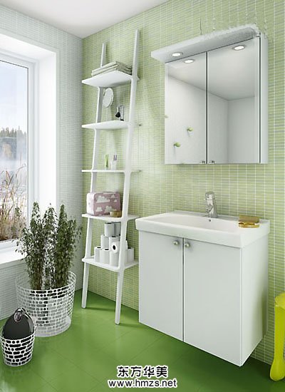 白色擱架幫助擴(kuò)充浴室柜收納空間,簡(jiǎn)練大方,在綠色地板的映襯下顯得更加潔白典雅。