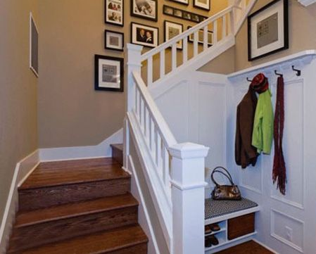 家中空間太小沒有衣帽間怎么辦,上面的這種拐角衣帽間設計則為你提供大大的便利,窄小的拐角可以放置下鞋柜和衣帽架等設施,而簡約的白色不僅延續了整個樓梯的配色,而且也將衣帽間巧妙的隱藏了起來,如此精巧設計,簡約大方,讓人喜愛不已。