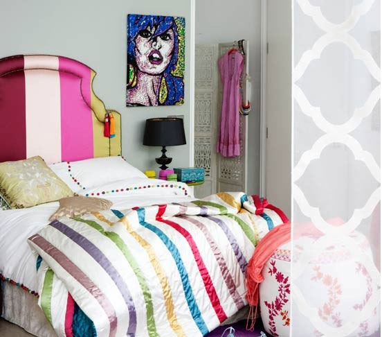 仿佛是打開的薰衣草一般的夢幻淡紫撲面而來,那樣清淺的顏色糅合了紫色的沉郁和白色的 純粹,再搭配精致的粉色,更添一種浪漫風情,斑斕的碎花床罩,突出的是一種自然詩意朦朧,明快的藤黃更是帶來了一種春一般的溫暖感覺。