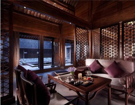 同中式建筑的恢弘格局相同,整個內室的裝飾強調的是一種內室文化的豐富性和內涵感,同整個內室的典雅色調相同,暗棕搭配沉紫是一種視覺上的典雅和美觀,精雕細琢的花窗,簡約典雅的條案,將一種中式美學的含蓄和婉約盡情展現,同那桌案上的細致紋理相同,原木所具有的特殊色澤也為內室增色不少。