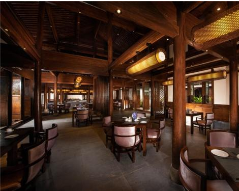 沒有繼續延續內室的宮燈使用,而是別出心裁的使用描紅紙傘來對內室做一番裝飾點綴,如此別出心裁的設計,可見設計師的非凡設計功底,懸吊在半空中的群傘裝飾,不僅有效的將內室空間等比例分割開來,更是為內室營造出一種別致的婉約美感,仿佛是那青石板上想起的零丁聲響,自那暈開的水滴之間,恍然見到一俏麗女子模糊花顏,巧笑倩兮,美目盼兮,顧盼之間蕩出的是千年凝萃的詩畫風流。