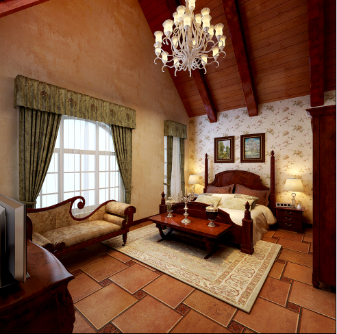茂盛生長的綠植被栽種在原木拼接的花盆之中,古樸而又自然,造型雅觀的特色抱枕服帖的被堆靠在美人靠上,沉靜又安閑。那在灰綠色窗簾上綻放的小花,精致又繁復,一如陰郁的雨中花園中盛開的薔薇,細瘦的枝葉在顫微微的在雨中凋零,為內室營造了一種傾頹的自然美感,而懸吊在空中的水晶吊燈,精美奢華,仿佛是那舞者展開的一休一般,帶著美妙的弧度和力度,盈盈綻放,那微曲的線條也將華麗的蓬蓬裙的形狀巧妙勾勒,而與之相對應的是擺放在原木茶幾上的古樸臺燈,仿佛只被安放在床邊屋角,像一個暮年的老人一樣的沉默而寧靜,沒有反復的絮叨,沒有擾人的叮嚀,就那樣在黑暗中,帶著寡言的寂靜,一如在歷史中沉淀的風塵,滿載著時間的厚度悄然佇立。
