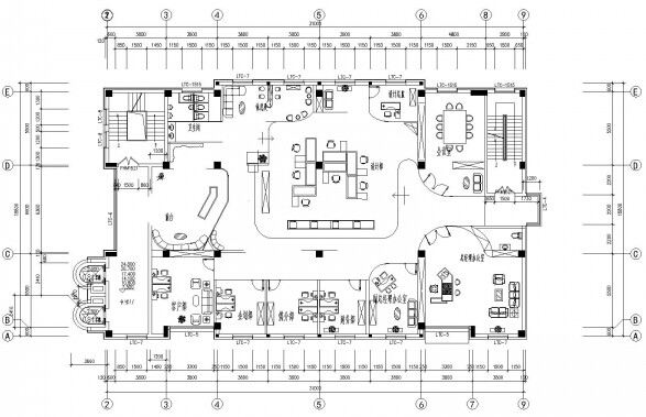 ▄原建筑結構分析: 甲方的辦公空間需要的功能區域包括前臺接待區、公共辦公區、會議室、總經理辦公室、走廊、茶水間、綜合辦公室、財務室、洽談室等。我們的設計師據此完成了平面布置圖和一系列的施工圖。