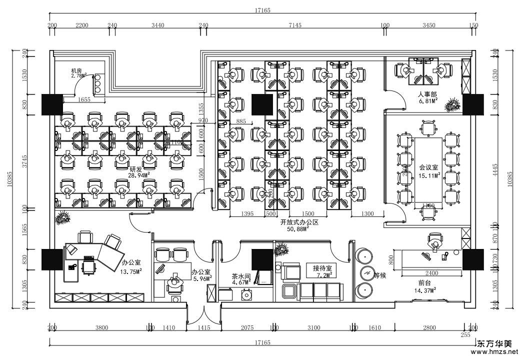 ▄原建筑結(jié)構(gòu)分析: 總經(jīng)理辦公室、財務(wù)室和一些特別的會議室外,建議采用全通透或者半通透的隔斷,這樣可以增加企業(yè)融合力和方便交流,也便于員工互相監(jiān)督。在裝修設(shè)計中要突出重點區(qū)域,抓住幾個關(guān)鍵點,例如前臺、會議室、總經(jīng)理辦公室等空間。要盡可能少地采取大的裝修結(jié)構(gòu)和造型,多用燈光和色彩以及現(xiàn)代化的配飾組合取得良好的裝飾效果。
