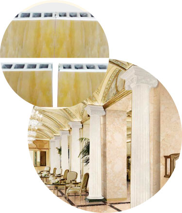 [華美藝術隔斷] : 通過將建筑、尾礦等余料回收,通過自主發明的全新第五代水性環氧互穿技術制造而成的無污染、可私人定制的仿石產品。產品實現了綠色循環、資源再生,可代替陶瓷、天然大理石、玻璃、木材等相關建筑裝飾、裝修材料。